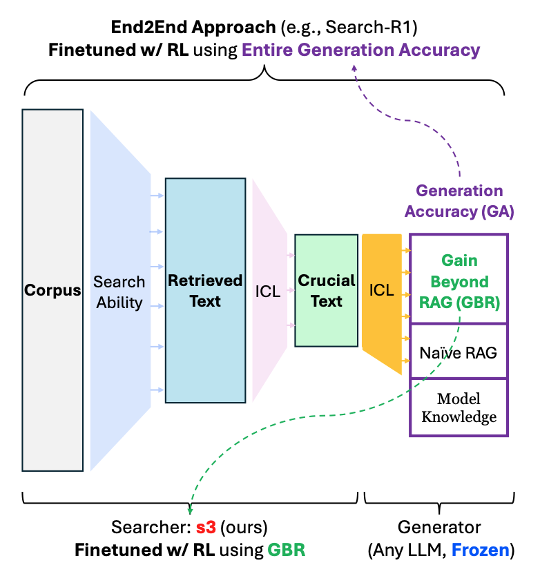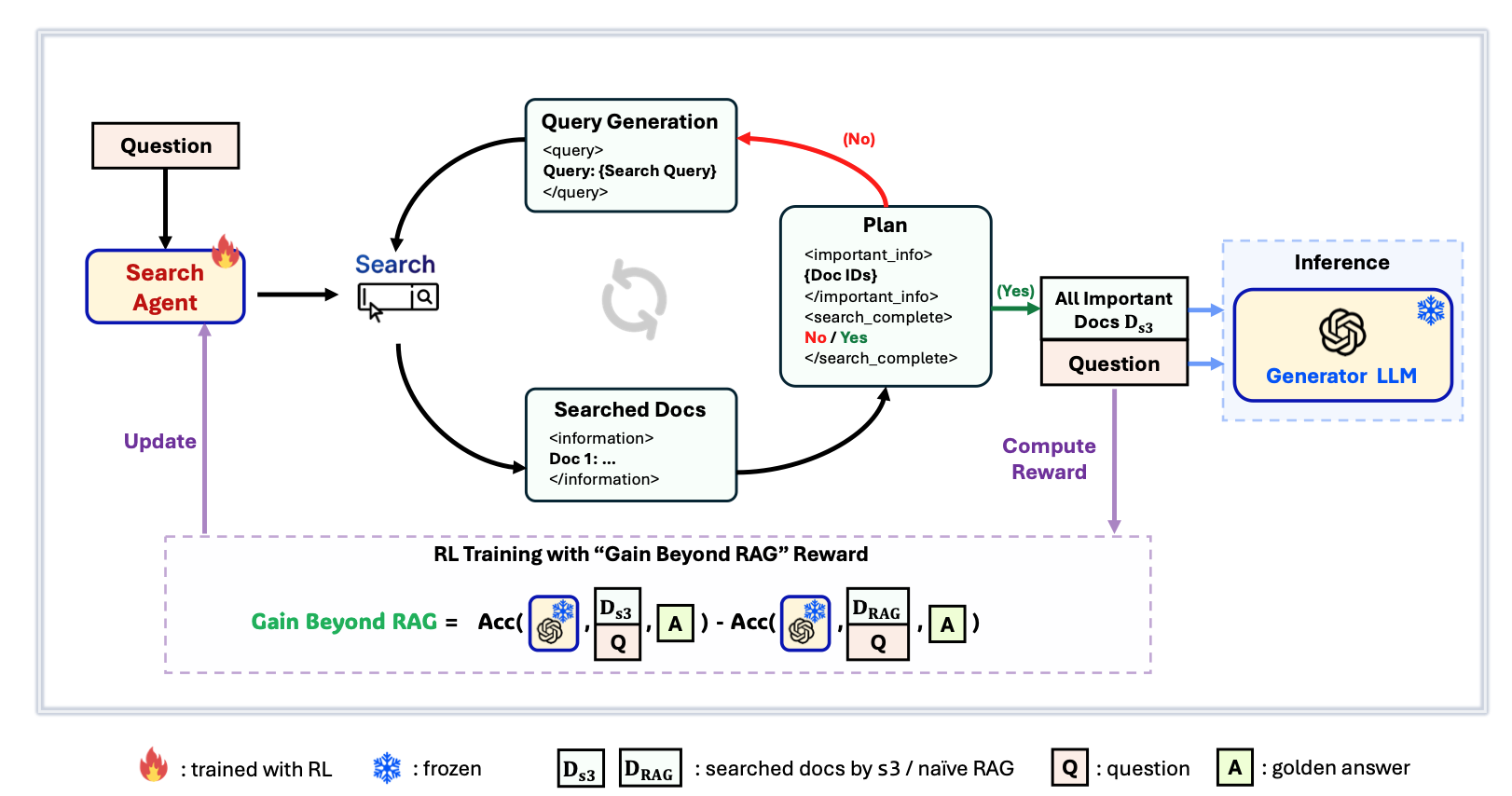 In this work, we propose s3, a lightweight, model-agnostic framework that decouples the searcher from the generator using only 2.4k data in the RL training process.