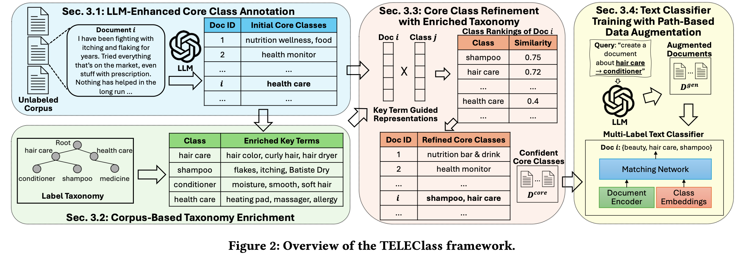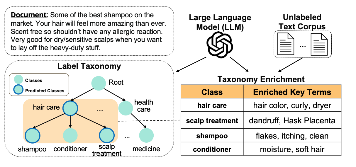 We propose TELEClass, which combines the general knowledge of LLMs and task-specific features mined from an unlabeled corpus. TELEClass automatically enriches the label taxonomy with class-indicative features and utilizes novel LLM-based data annotation and generation methods specifically tailored for hierarchical text classification.